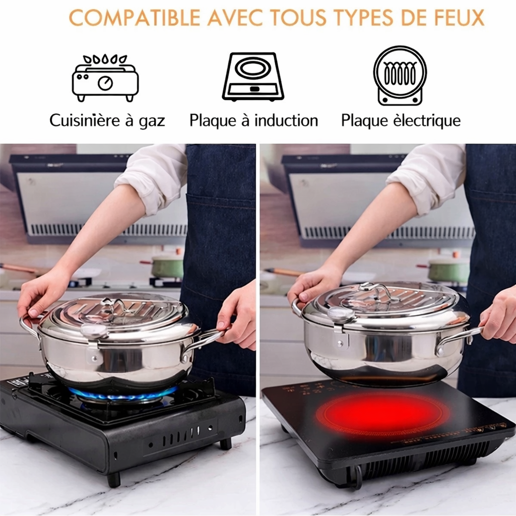 Découvrez FryMaster™, la casserole de friture en acier inoxydable conçue pour réussir toutes vos fritures facilement, proprement et en toute sécurité. Grâce à son panier amovible, son thermomètre intégré et son couvercle avec grille d’égouttage, vous obtenez des fritures croustillantes à l’extérieur et fondantes à l’intérieur, sans éclaboussures ni gaspillage d’huile.
